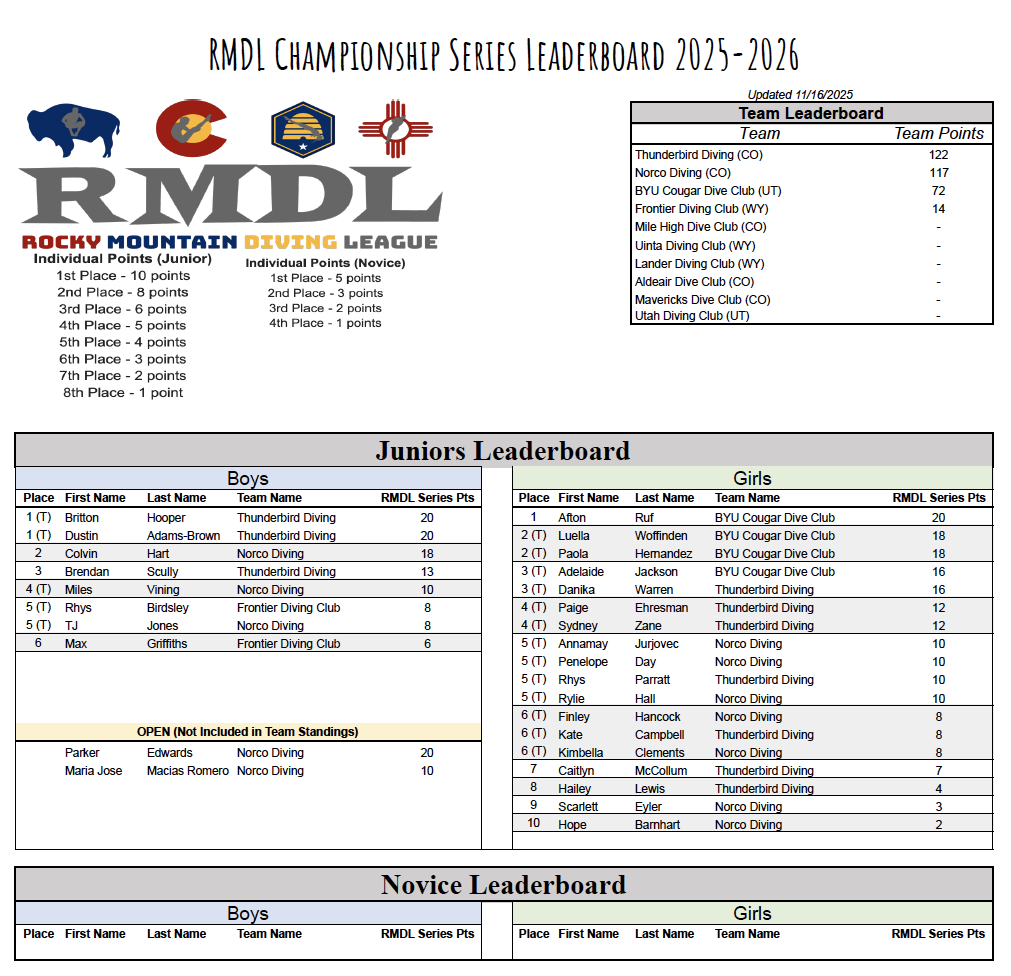 If a diver moves up to the Jr category throughout the season, any Novice points will remain in the Novice category and Junior points in the Jr Category.